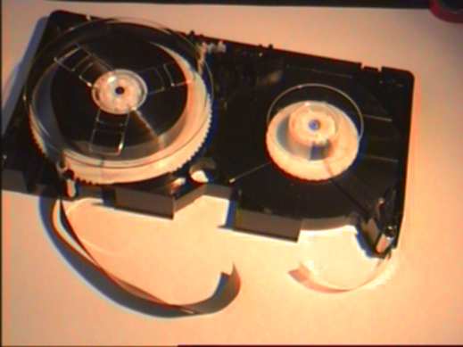 Prenez le petite bobine vide et mettez-la dans la K7 réceptrice comme ci-dessus puis raccordez les bandes entre elles, remontez la K7 et enroulez 30 à 45 minutes de bande sur la petite bobine (pour 30 à 45 minutes se fier au compteur temps réel du magnétoscope ou surveillez la k7 en la ressortant régulièrement).