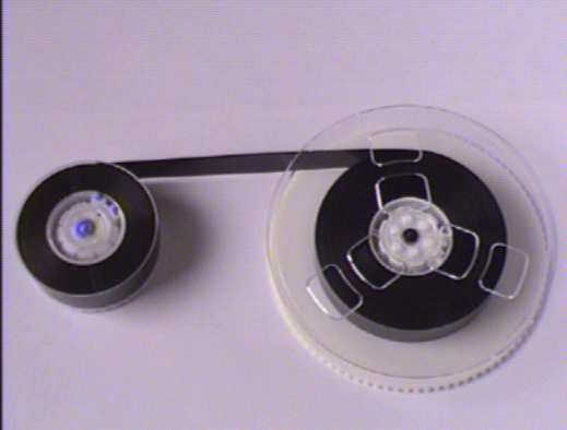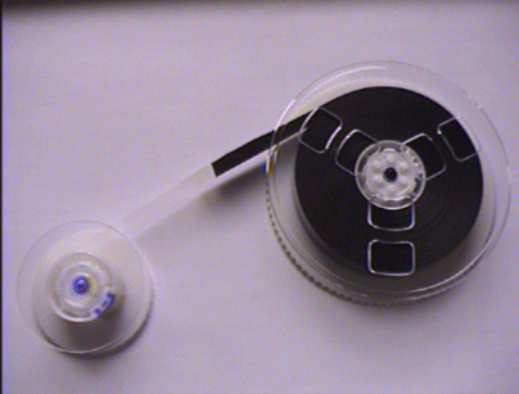 Après ceci, on démonte la K7 et on récupère les 2 bobines qui doivent être comme la photo au dessus (sur la photo il y a une quantité de bande importante à droite car j'ai déja assemblé 3 bandes a la suite l'une de l'autre). Coupez la bande et mettez la bobine de droite dans son boîtier.