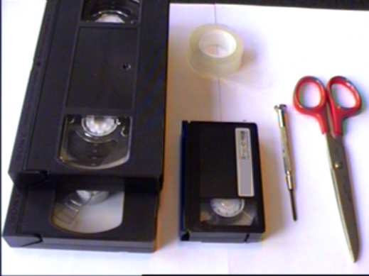 Vous avez besoin de 2 cassettes VHS : une qui servira à acceuillir la bande enregitrée sur votre camescope et l'autre à fournir la bande vierge pour recharger votre cassette VHS-C, d'une paire de sciseaux, d'un rouleau de scotch, d'un petit tournevis cruciforme et biensûr de votre cassette VHS-C enregistrée.
