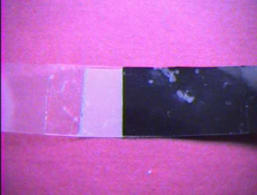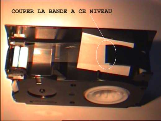 Ensuite vous devez couper la bande magnétique (sur les 3 K7) juste à l'intersection entre la bande d'amorce transparente et la bande noire (voir ci-dessus). Attention ne jamais raccoucir la bande d'amorce, elle est très importante car elle permet au magnétoscope de détecter le début, le milieu et la fin de bande grâce à une double barrière infrarouge.
