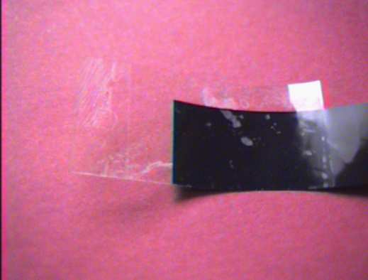 Vous devez maintenant raccorder la bande de la K7 VHS-C que vous avez coupée avec la bande amorce du porte bobine vide de la K7 VHS réceptrice. Pour cette opération vos mains, ainsi que le plan de travail doivent être parfaitement propes et secs. Mettez la bobine de la K7 VHS-C sur votre gauche et l'autre bobine à votre droite, puis découpez un bout de scotch de 2 cms que vous collerez comme sur la photo ci-dessus.