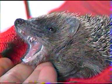 La bouche du petit hérisson est constituée de petites dents pointues qui à l'âge adulte sont au nombre de 36.(Si vous donnez de la nourriture aux hérissons il faut leur donner de la paté mais également des croquettes moelleuses afin d'éviter des problèmes de gencives).