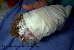 Ce hérisson s'est retrouvé avec un lien à la patte ce qui a constitué un garrot et coupé la circulation d'où une patte gonflée.