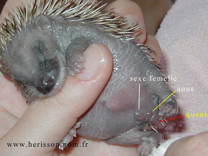 Chez le hérisson mâle le sexe est situé en plein milieu du ventre alors que chez la femelle le sexe est placé entre les pattes arrière tout près de son anus.